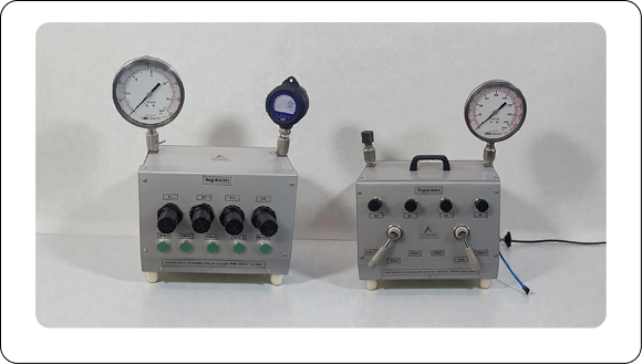 The 5-Point Pressure Gauge Tester by Techmark Engineering Solutions is designed for fast and repeatable calibration of pressure gauges using preset pressure levels. The operator initially sets the desired pressure points through regulators, after which the system reproduces the same pressures whenever the corresponding selector is operated.