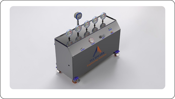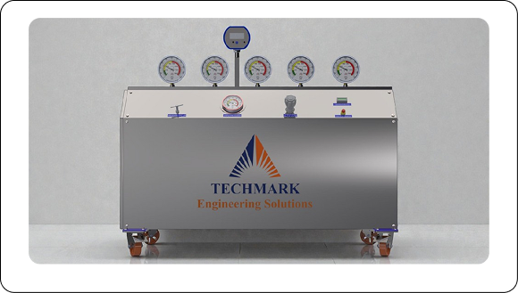 The Multiport Pressure Testing Skid by Techmark Engineering Solutions is designed for fast and accurate simultaneous testing of multiple pressure instruments and components. It features an inbuilt pneumatic pressure source up to 300 bar with fine pressure control and multiple monitoring gauges, and can be optionally equipped with a hydraulic source up to 1000 bar.